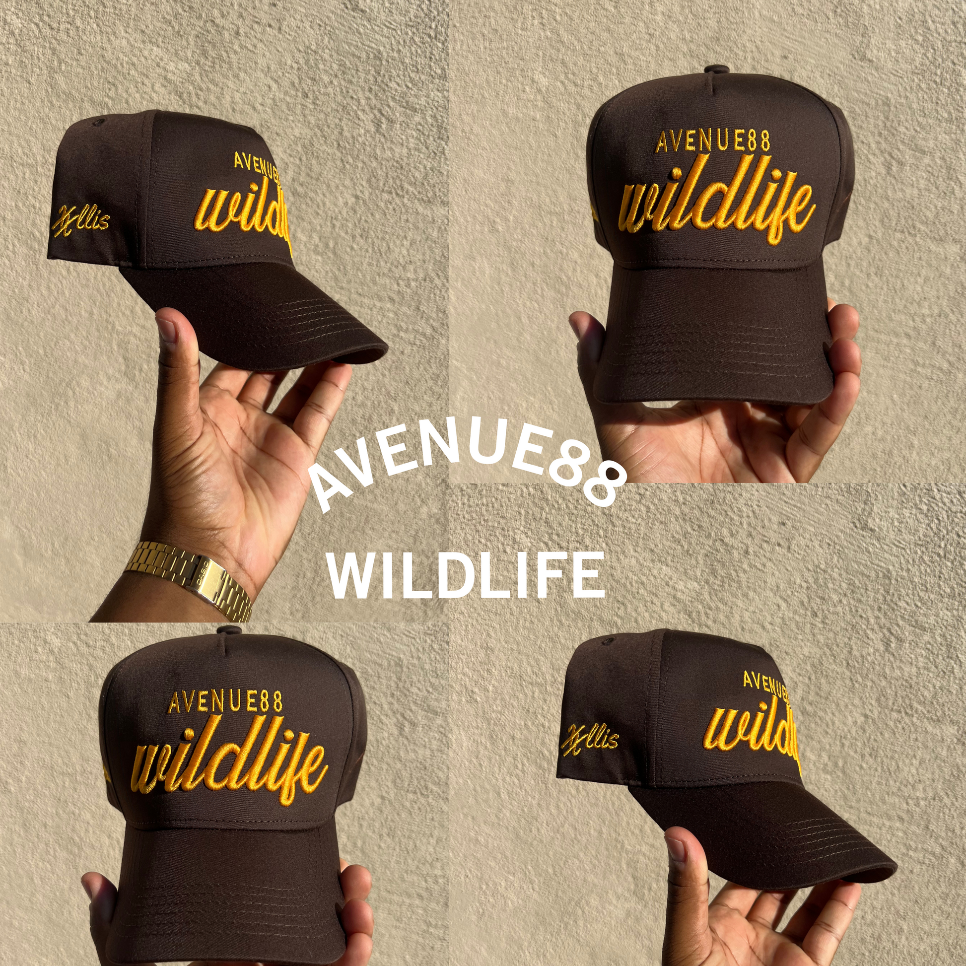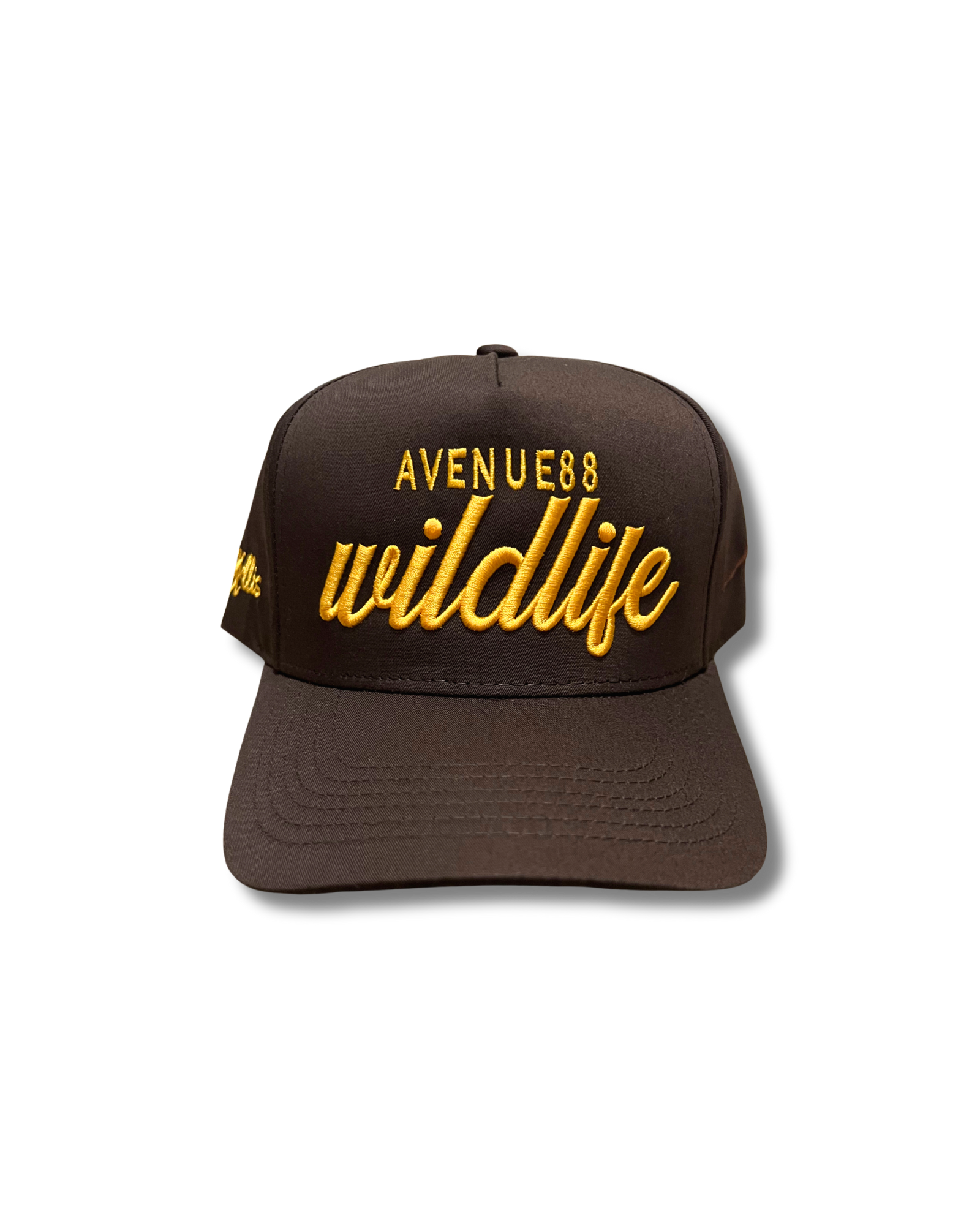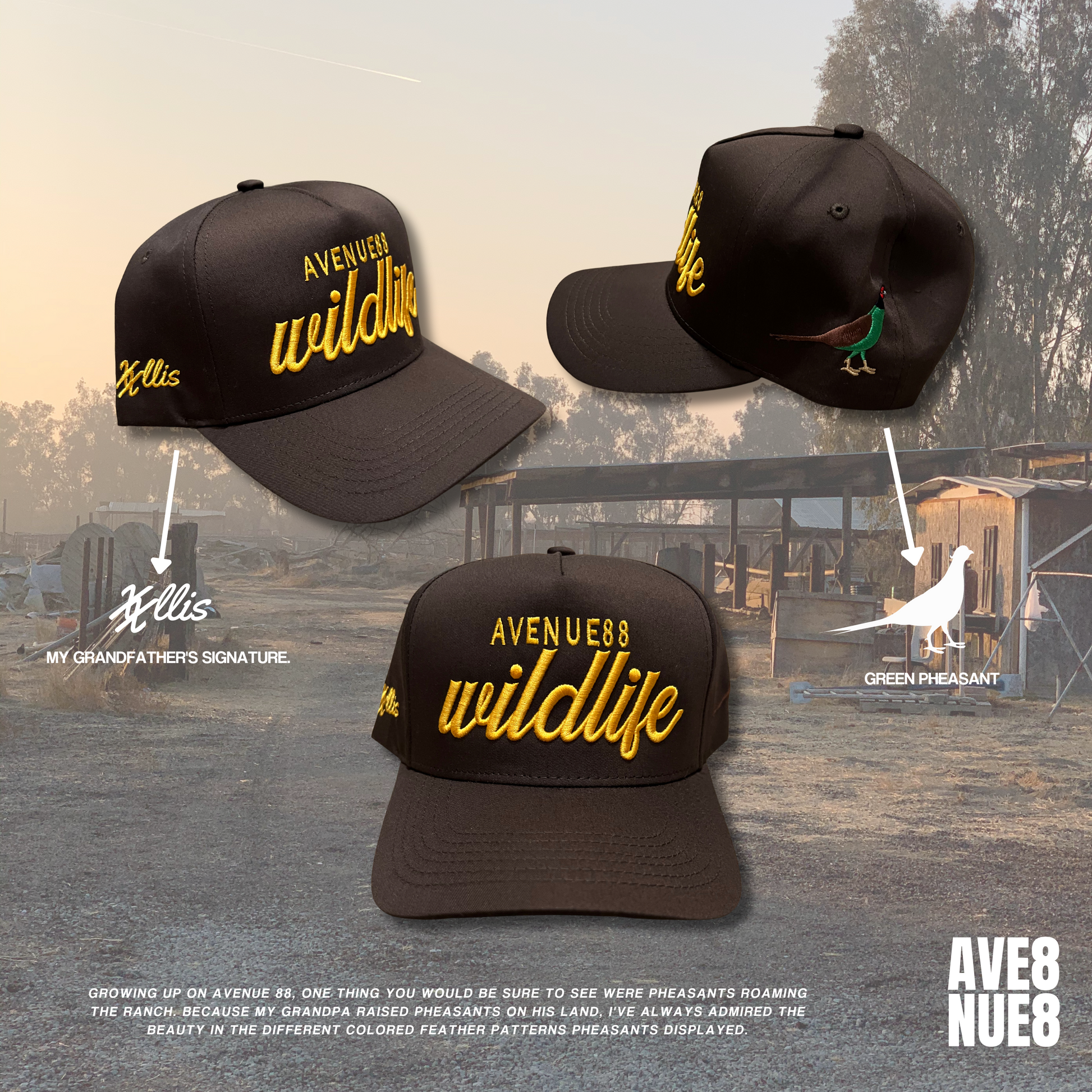 This five-panel snapback hat features a brown crown and brim, as well as 3D cursive wildlife embroidery on the front. A green pheasant graces the left side, while the right side boasts my grandfather's signature, "Ellis". This stylish cap is a perfect addition to any outfit.