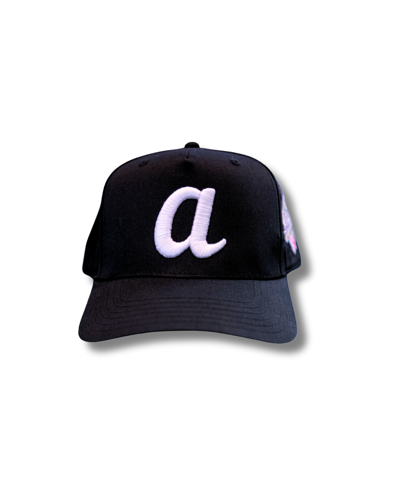 Black and white Baseball Cap features an embroidered design on the front and a custom patch sewn on the left side. It also has a snapback closure and is one size fits most.