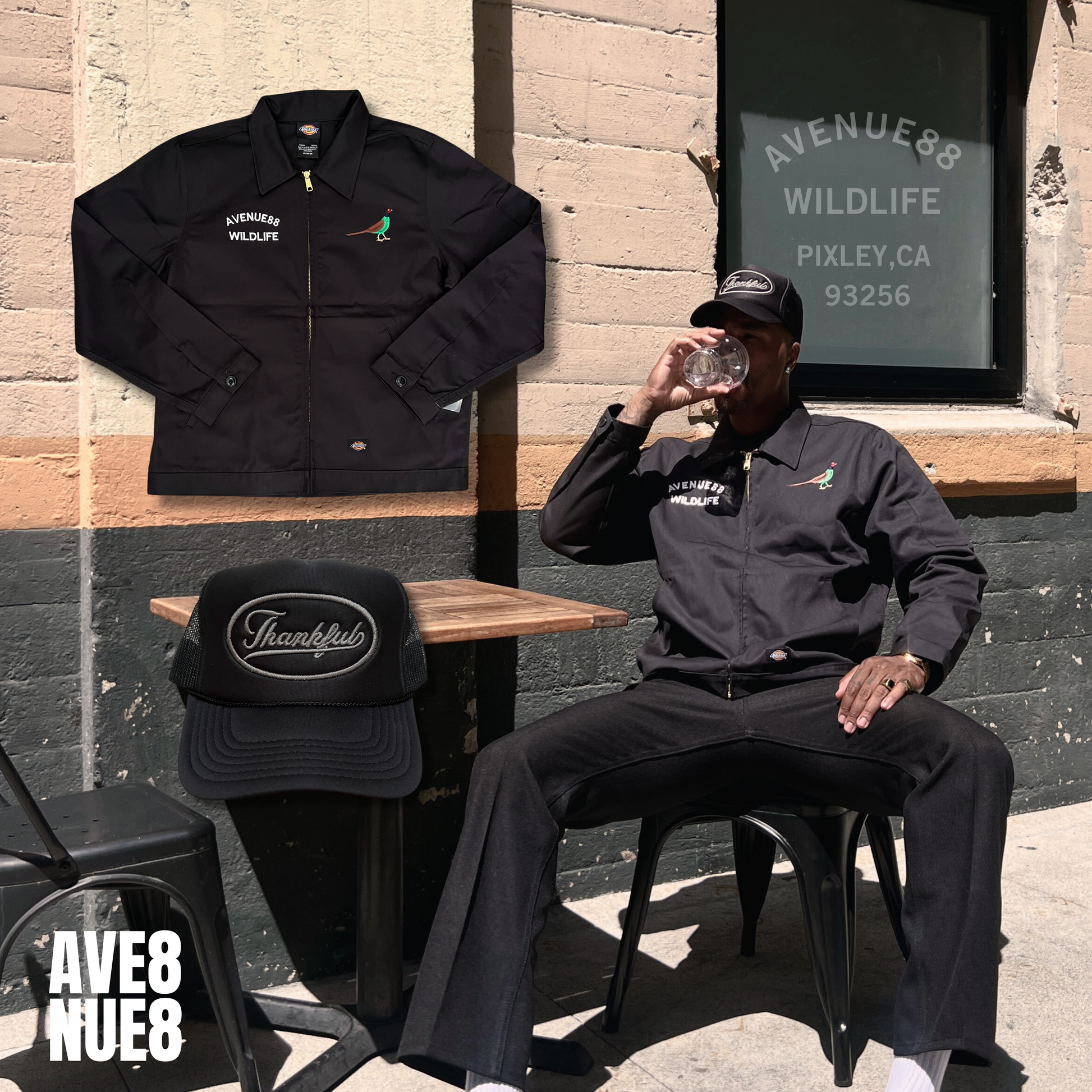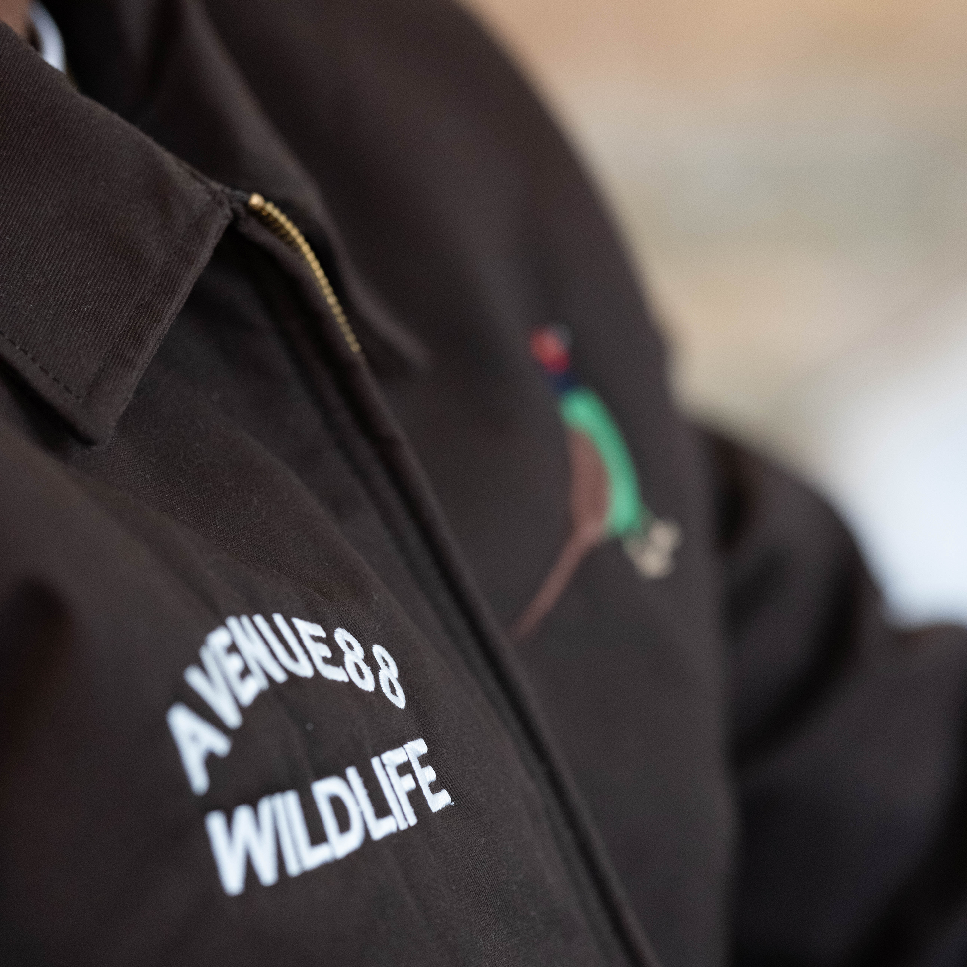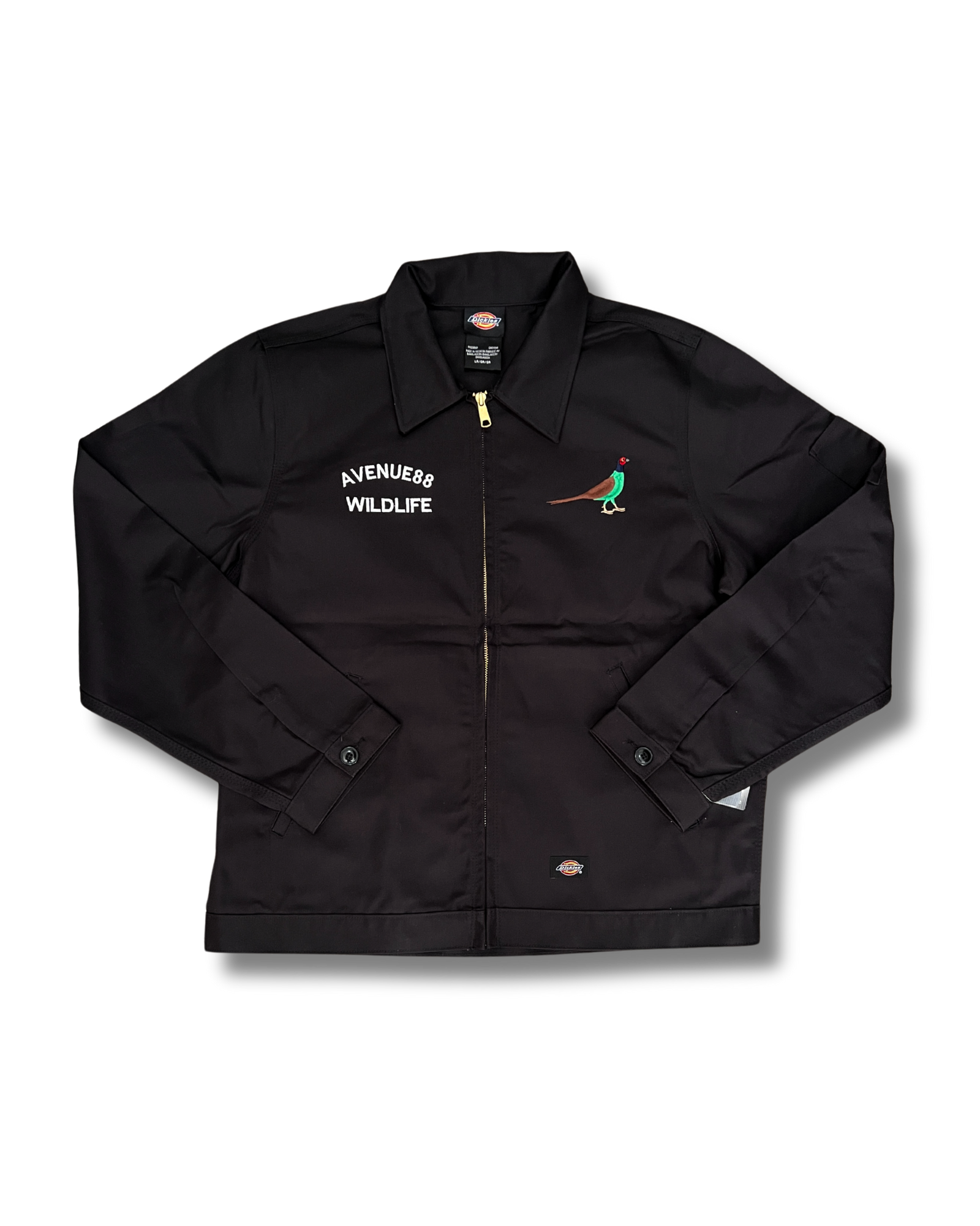 This stylish, Black Dickies lined Eisenhower Jacket is made with a combination of 65% polyester and 35% cotton twill. A beautiful embroidered green pheasant adorns the left chest, while Avenue 88 Wildlife is featured on the right. It boasts welt pockets on the front, a pencil pocket on the sleeve, slash-front pockets, adjustable tabs at the waistband, and is designed to be machine washable.